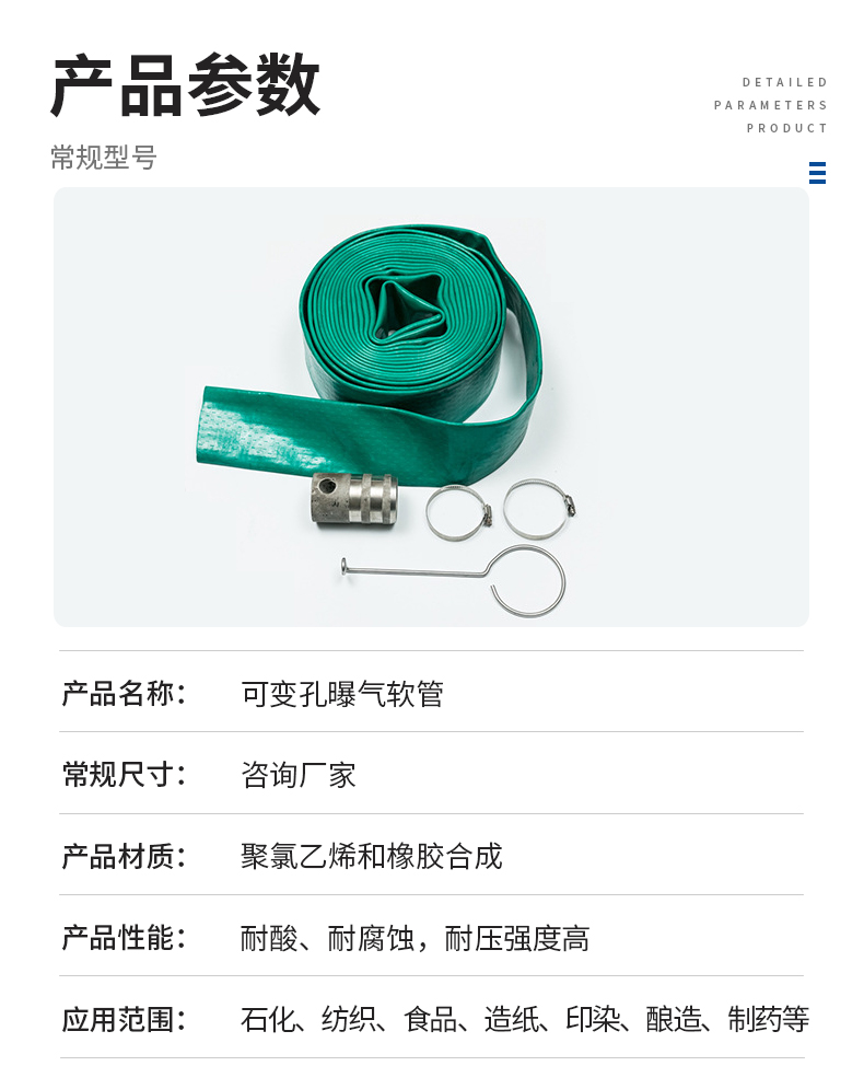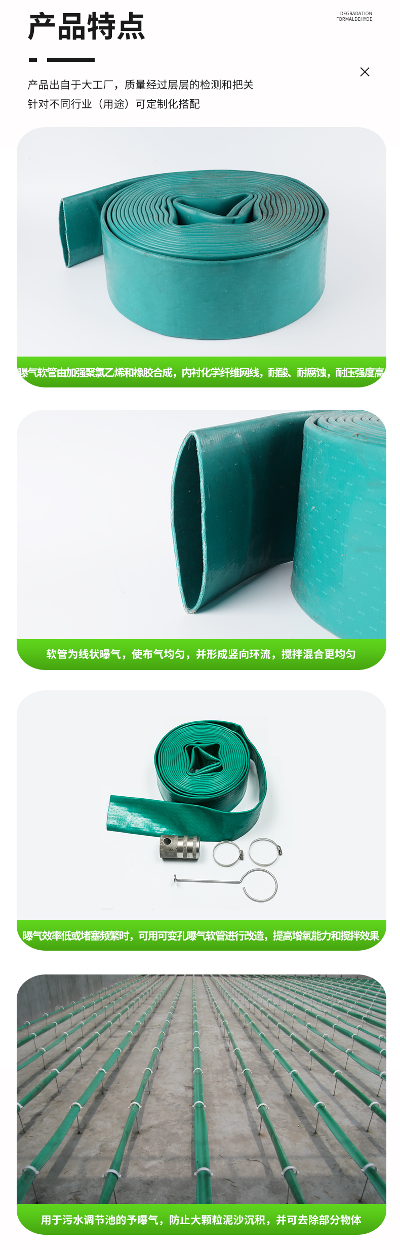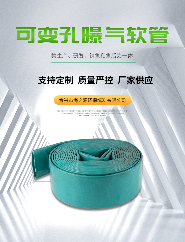 曝氣軟管是引進西德技術開發成功的新型增氧曝氣器。薄壁、直通道極大降低了曝氣阻力損失;可變孔及狹縫自動開閉,徹底解決了曝氣器的堵塞問題;軟管為線狀曝氣,使布氣均勻,并形成豎向環流,攪拌混合更均勻;氣泡小,氧利用率和動力效率高。