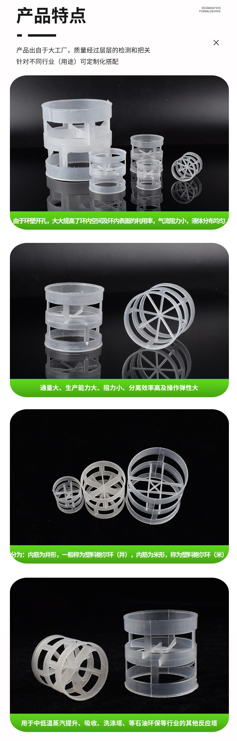 鮑爾環填料是采用金屬薄板沖扎制成,在環壁 上開出了兩排帶有內伸舌葉的窗孔,每排窗有五個舌葉彎入環內,指向環心,在中心處幾乎相搭,上下兩層窗孔的位置相互錯開,一般開孔的總面積約為整個環面積的35%左右。