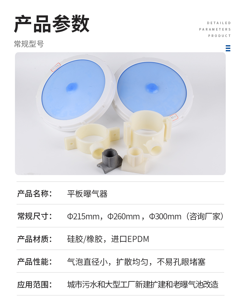 平板膜片曝氣器,該裝置曝氣氣泡直徑小,氣液界面直徑小,氣液界面積大,氣泡擴散均勻,不會產生孔眼堵塞,耐腐蝕性強,經上海同濟大學環境工程學院和中國市政工程華北設計院進行清水和污水充氧測試,并經50多家用戶多年使用效果良好(比常規產品固定螺旋曝氣器,散流曝氣器和穿孔管曝氣器能耗降低40%,或增加污水處理量40%)。特別適用于城市污水和大型工廠新建擴建和老曝氣池改造,且曝氣池可間歇運行。